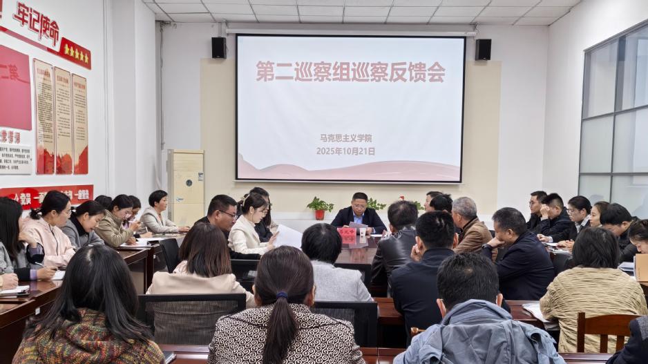 10 月 21 日,校党委第二巡察组向马克思主义学院党支部反馈巡察意见,学院领导班子成员、全体教职工参会。