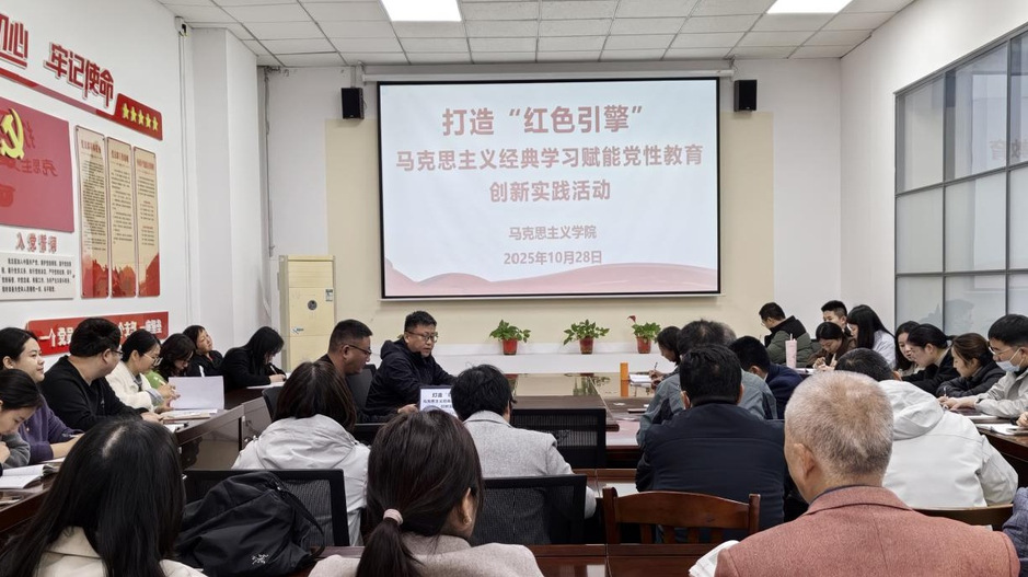 10 月 28 日,马克思主义学院 “打造‘红色引擎’马克思主义经典学习赋能党性教育创新实践活动(三)” 如期召开。邓鹏院长主持会议并作专题辅导,全体教职工参会并展开深入研讨。